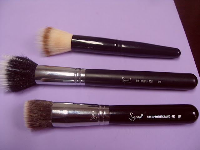 O da Santa Clara com o F50 são muito parecidos, muito mesmo, o da Sigma é maior e um pouco mais denso, mas o resultado final é quase o mesmo, passo blush ou pó compacto com esses dois, esfumam bem o blush. Agora minha paixão (acho que de todas), o F80, ah o F80 (até suspiro, rsrs), vale cada centavo, ou até mais, ele é perfeito para passar base, acho qualquer base chifrin fica ótima com ele.